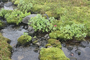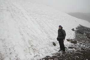 Der Skyline Loop mit dem High Skyline Trail ist unter Strenuous Trails aufgeführt: ein Rundweg von 5,5 Meilen mit 518 Metern Höhenunterschied, durchschnittliche Wanderzeit: 4,5 Stunden. Ob sich die Anstrengung überhaupt lohnt bei dem Wetter? Nun ja. Um 10.30 Uhr liefen wir los. Zunächst ging es zu den schönen Myrtle Falls. Bei gutem Wetter kann man hinter dem Wasserfall den Mount Rainier sehen. Der Regen hörte zwischenzeitlich zum Glück wieder auf. Und die Wanderung war wunderschön. Kleine Bäche, Wasserfälle, Blumenwiesen (die im Juli und August herrlich sein müssen). Hier möchte ich noch mal laufen, wenn sich der Mount Rainier zeigt! Nach 1,5 Stunden erreichten wir den Abzweig zum Golden Gate Trail. Hier hätten wir in einem Loop zurück zum Visitor Center abkürzen können. Und wir waren nahe dran. Aber dann kam ein Wanderer von oben, und wir fragten ihn, wie es dort war. Und er sagte, es hätte immer wieder Wolkenlücken gegeben. Da wir gerade eine solche Wolkenlücke erlebt hatten, hatten wir Hoffnung, also weiter! Wir waren schon auf Höhe der ersten Schneefelder. Es ging noch mal ganz schön hoch. Und die Sicht wurde immer schlechter, so dass wir es bald bereuten, weitergelaufen zu sein. Wir erreichten das Geröllfeld. Hier oben fegte der Wind. Wir fühlten uns wie Reinhold Messner bei der Besteigung des Mount Everest. Man sah nur noch wenige Meter weit. Schneeregen peitschte uns ins Gesicht, und es war nicht ganz ungefährlich auf den nassen Steinen.
