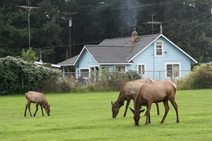 Zum Abendessen gibt es in Packwood wenig Alternativen: Cruiser’s Pizza, Peter’s Inn und den Blue Spruce Saloon. Wir entscheiden uns für Cruiser’s. Leider nehmen wir nicht die Pizza, die wohl ganz OK sein soll, sondern Burger und Fish & Chips. Der Laden ist ungemütlich, man muss an der Theke bestellen, und das Essen war nicht so besonders. Mit einem Bier und einer Cola zahlen wir dafür immerhin noch $29. Für das gleiche Geld haben wir schon oft sehr viel besser gegessen. Auf der Rückfahrt ins Motel sehen wir noch ein paar Wapitis durch den Ort laufen.