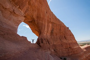 steilen Slickrockabsatz unter dem Arch nach oben klettert, kommt man