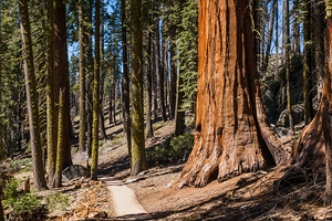 Rundweg um eine Wiese, die mit Mammutbäumen umgeben ist. Der Sequoia