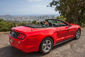 Ford Mustang Cabrio in der Farbe rot mit 2257 Meilen auf dem Tacho. Dafür