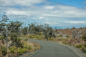 Straße weiter nach Kalapana. Man fährt zwischen Baumtunneln und Palmen am