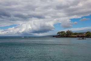 zunächst sonnig, dann dunkle Wolken und Regen über Kona, nachmittags Sonne